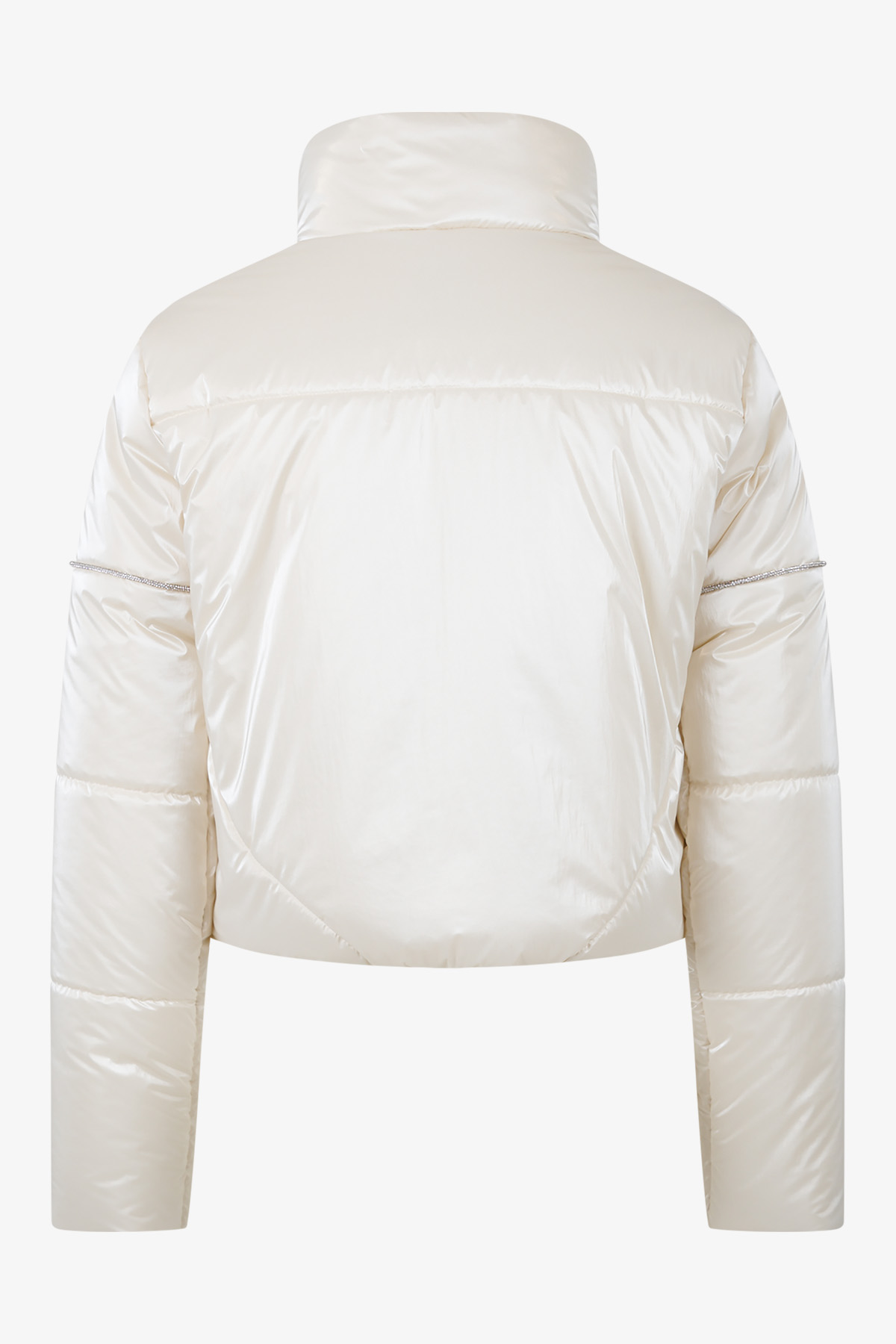 Módní krátká prošívaná outdoor bunda s elegantním stojatým límcem, která kombinuje funkčnost a styl. Třpytivá lemovka se štrasem dodává lesklý akcent a činí bundu výrazným a nepřehlédnutelným kouskem. Barva slonové kosti s perleťovým leskem zaujme každého. Límec je vyšší, stojatý límec se štrasovou tkaničkou. Rukáv má štrasovou lemovkou na paži. Zapínání vepředu je na dvoucestný zip a štrasová lemovka oživí tento model. Zadní lem je mírně prodloužený, uvnitř s elastickou páskou.