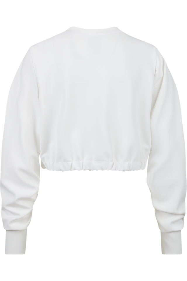 Tento trendy svetr má sofistikované řasené rukávy a embosovaný přední díl. Okraje mu dodávají moderní vzhled se stylovými štrasovými detaily. Střih zvýrazňující postavu, celkově stylový, mírně extravagantní. Rukávy jsou dlouhé rukávy s manžetami na lemu, sofistikované nařasení gumou na vnitřní straně rukávů, plochý dekorativní šev přes rukávy.